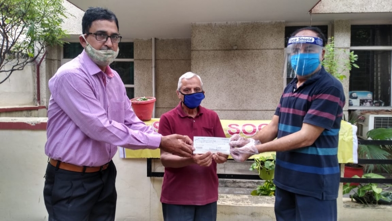 Sh G.K. Bhatnagar President Sudha society and Sh. Amitabh Khare Resident of A1-BLOCK South City 2 is handing over cheque of Rs.55000/- to Sh.Rajesh Kumar Estate manager RWA South City 2 for credit of amount in Mrs.Sonmati account which will be kept as a Fixed Deposit ( FD) in the bank and interst earned quarterly will be used Mrs.Sonmati son ( Aryan-12 years ) further studies.