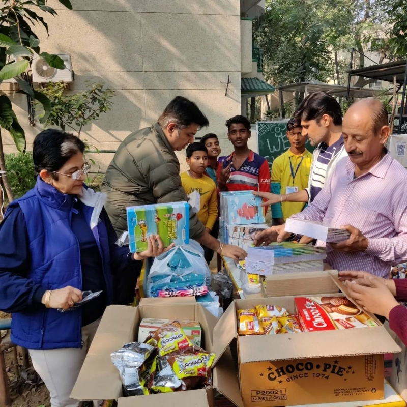 Today a team of members of Sadhu Vaswani Mission lead by Mr Amit Bhatia distributed notebooks, stationery items, towel for hygiene and eatables to the students of Sudha Society Open School.