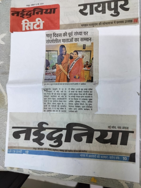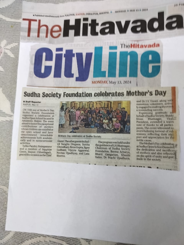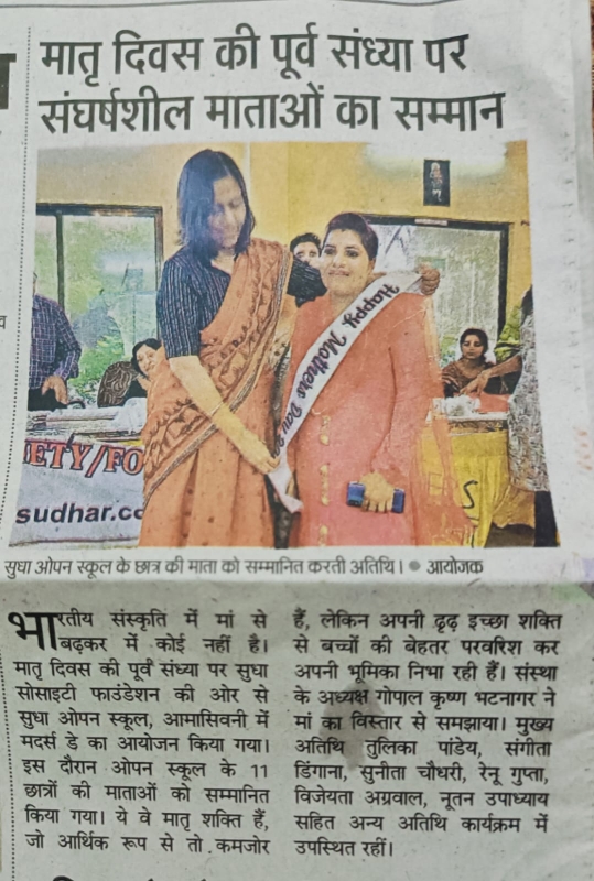 माता साक्षात भगवान के समान है, क्योंकि वह हमें जन्म देती है और पहले गुरु है । इस लिये मातृ सम्मान के लिए सुधा सोसाइटी फाउंडेशन ने “मदर्स डे “की पूर्व संध्या पर 11/05/24 को सुधा ओपन स्कूल ,आमासिवनी रायपुर में “मदर्स डे “का आयोजन किया और ओपन स्कूल के 11 छात्रों की माताओं को सम्मानित किया जो ओपन स्कूल आमासिवनी में पढ़ रहे हैं ।