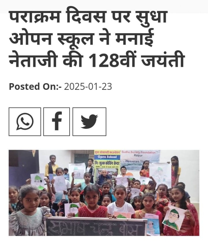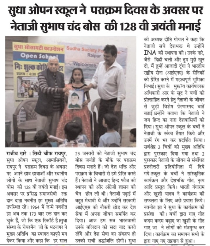 सुधा ओपन स्कूल , आमासिवनी , रायपुर ने “पराक्रम दिवस “के अवसर पर अपने छात्र और सामाज के लोगो के साथ नेताजी सुभाष चंद बोस की १२८ वी जयंती मनाई । इस अवसर पर प्रसिद्ध समाजसेवी रक्त दान दाता श्री नवनीत झा मुख्य अतिथि उपस्थित रहे । १९६४ में जन्मे झा जी अब तक १७३ बार रक्त दान कर चुके है और इसका उन्होने एक रिकॉर्ड बनया है ।सुधा संस्था के चेयरमैन श्री जी के भटनागर ने मुख्य अतिथि का स्वागत काफ़ी मग देकर किया और कहा कि हर साल 23 जनवरी को नेताजी सुभाष चंद्र बोस जयंती के मौके पर पराक्रम दिवस मनाते हैं। जो देश भक्ति और पराक्रम के विचारो से हमे प्रेरित कर ते है । नेताजी ने आजाद हिन्द फौज की स्थापन की और अंग्रेजी शासन की चैन छील ली थी । पढ़ाई में वे बहुत मेधावी छात्र थे और उन्होंने सरकारी आईएएस की नौकरी छोड़ कर देश सेवा में लग गए । आज हम सब भारतवासी उनके बलिदान को सदा याद करते रहेगे और देश सेवा का संकल्प ही उनको सच्ची श्रद्धांजलि होगी । सुधा की अध्यक्ष श्रीमती दीप्ति गोयल ने कहा कि नेताजी सच्चे देशभक्त थे उन्होंने INA की स्थापना की । उन् के नारे, जैसे ' दिल्ली चलो' और 'तुम मुझे खून दो, मैं तुम्हें आजादी दूंगा' ने भारतीय राष्ट्रीय सेना (आईएनए) के सैनिकों को प्रेरित करने में महत्वपूर्ण भूमिका निभाई। सुधा के मुख्य कार्यपालक अधिकारी CEO श्री आर के सूद ने बच्चों को प्रोत्साहित करने हेतु नेताजी के जीवन की ख़ास प्रेरणास्पद बाते बतायी । जय हिन्द का नारा भी उन्होंने दिया ।
