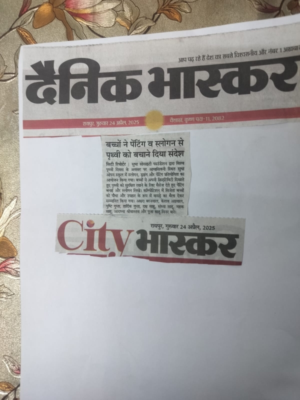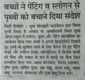 -सामाजिक संस्था सुधा सोसाइटी फाउंडेशन ने 22/4/25 को विश्व पृथ्वी दिवस मनाया । इस अवसर पर सोसाइटी द्वारा आयोजित स्लोगन + ड्राइंग और पेंटिंग प्रतियोगिता का आयोजन किया जिसका मुख्य उद्देश्य था धरती माता का बचाव और पर्यावरण संरक्षण । पृथ्वी दिवस एक वार्षिक आयोजन है जिसे 22 अप्रैल को दुनिया भर में पर्यावरण संरक्षण के लिए आयोजित किया जाता है। इसकी स्थापना अमेरिकी सीनेटर जेराल्ड नेल्सन ने 1970 में एक पर्यावरण शिक्षा के रूप की थी।